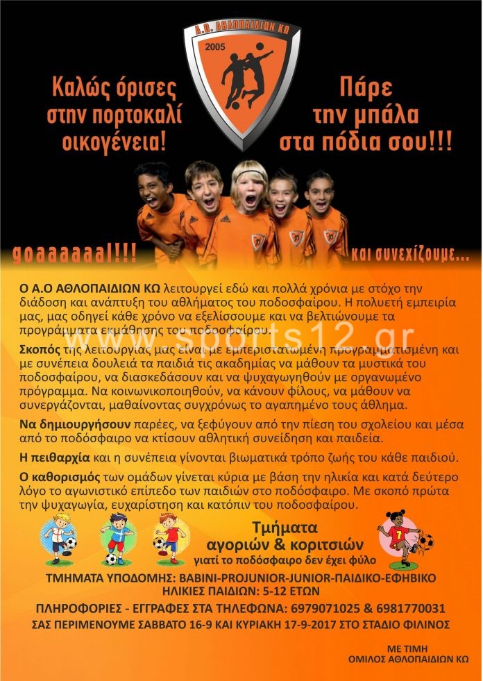 ΕπιλεγμέναΠοδόσφαιρο ΟΜΙΛΟΣ ΑΘΛΟΠΑΙΔΙΩΝ ΚΩ- ΕΓΓΡΑΦΕΣ Αύγουστος 27, 2017 2872 Κοινοποίηση στο Facebook Κάντε Tweet στο Twitter