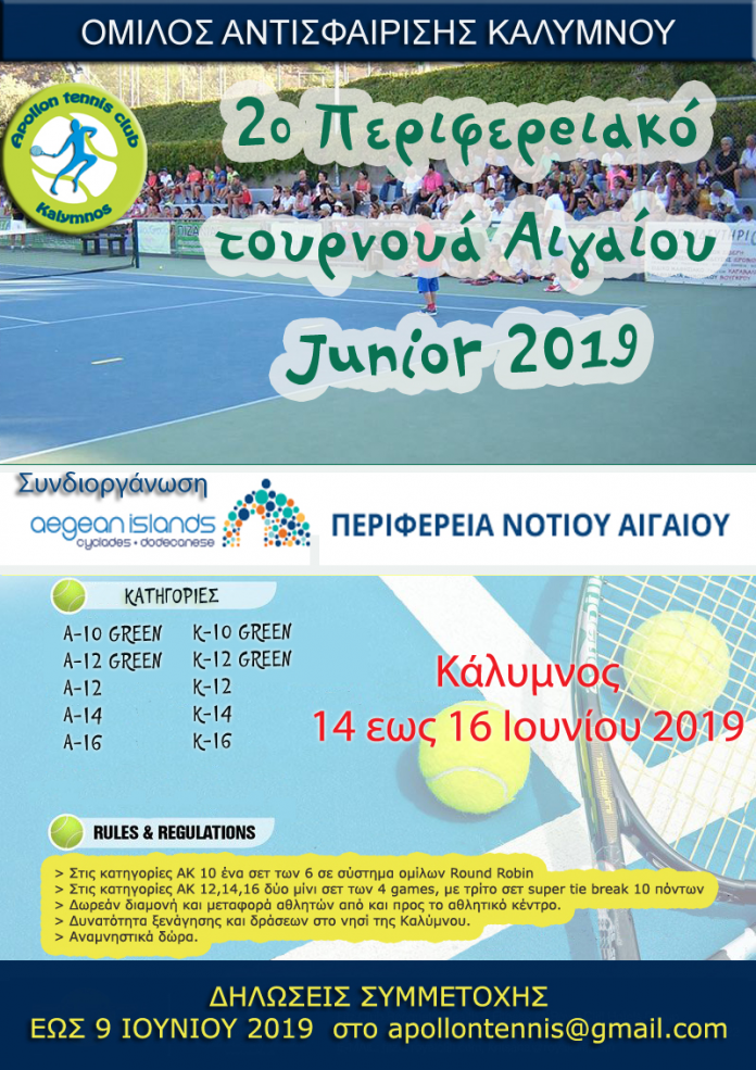 Ο Όμιλος Αντισφαίρισης Καλύμνου διοργανώνει το 2o Περιφερειακό Πρωτάθλημα Ν. Αιγαίου για Αγόρια – Κορίτσια 10-12-14-16 ετών από την Παρασκευή 14 έως την Κυριακή 16 Ιουνίου 2019 .